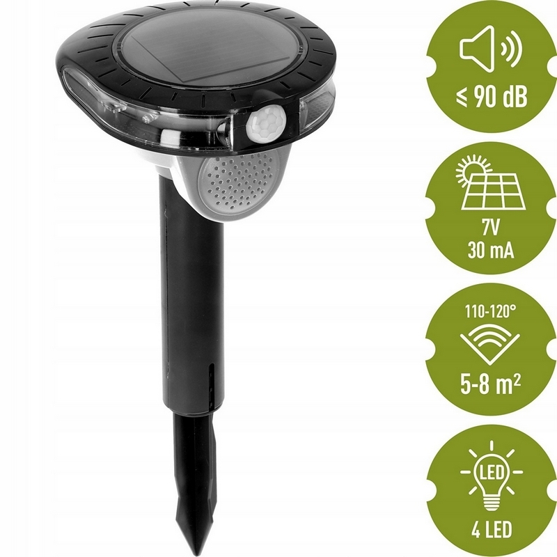 Solarny odstraszacz zwierząt (m.in. myszy, kun, szczurów) dźwiękowo-błyskowy pozwoli Ci skutecznie pozbyć się nieproszonych gości z Twojego ogrodu. Odstraszacz emituje sygnały na odległość 5-8 m, w promieniu o zakresie 110-120 stopni.