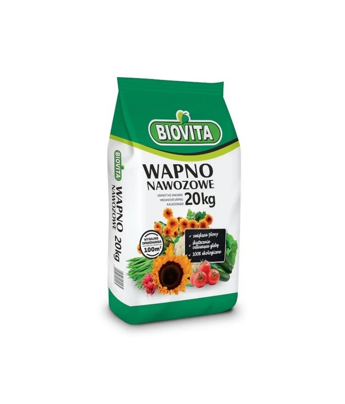 Wapno nawozowe firmy Biovita, to produkt zawierający w swym składzie magnez oraz wapń, dzięki czemu posiada dwu funkcyjne zastosowanie. Wapnem możemy zarówno nawozić jak i odkwaszać gleby ubogie, lekkie i średnie w swej strukturze. Produkt nie tylko dostarcza magnez ale również masę innych niezbędnych pierwiastków oraz mikroelementów wpływających na prawidłowa wegetację oraz rozwój roślin. Wapno nawozowe wyrównuje odczyn kwasowości gleby, oraz korzystnie wpływa na własności fizyczne. Dostarczenie wapnia do podłoża znacznie poprawia strukturę obecnej już próchnicy i utrzymuje korzystne wartości powietrzno-wodne.Wapno nawozowe węglanowe typ 04. Zawartość CaO min. 50%