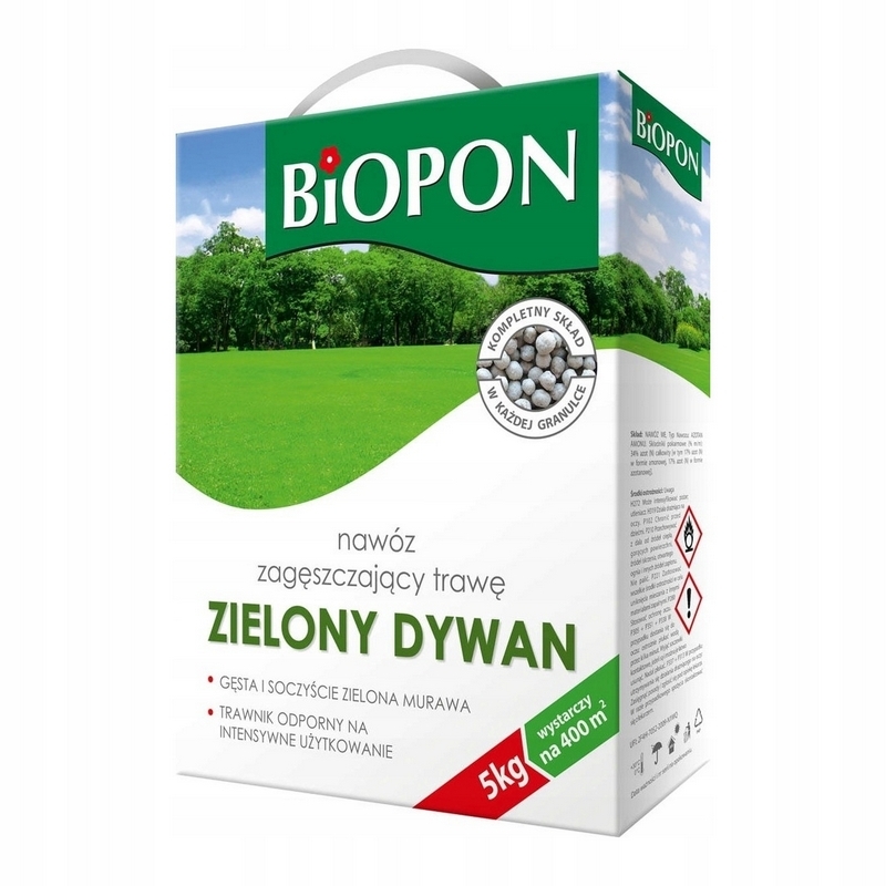 Nawóz do trawnika zagęszczający trawę BIOPON granulowany 5 kg⭐to odpowiednio dobrany zestaw składników mineralnych wspomaga rozwój systemu korzeniowego i przyspiesza rozkrzewianie się części zielonych trawy.