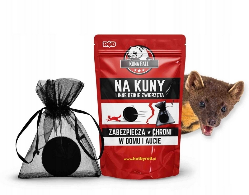 KUNA BALL marki RED to innowacyjny środek zapachowy do ochrony pojazdów i przestrzeni przed kunami i innymi dzikimi zwierzętami. Produkt został opracowany w formie kulistego wkładu, który stanowi bezkonkurencyjną ochronę dla samochodów, przyczep kempingowych, poddaszy czy strychów. Woreczek zapachowy na kuny zawiera laboratoryjnie opracowaną kompozycję zapachową, która jest rezultatem długotrwałych badań. Testy wielokrotnie potwierdziły niezwykłą skuteczność w warunkach naturalnych. Działanie preparatu polega na zniechęcaniu kun do przebywania w zasięgu emisji zapachów. Frakcje zapachowe zostały tak skomponowane, że kojarzą się z naturalnymi feromonami dzikich i wrogich zwierząt (lis, pies, kot, orzeł, jastrząb), co skutecznie tworzy tarczę ochronną i powstrzymuje kuny od przebywania w obszarze ich działania.