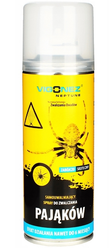 Preparat w aerozolu VIGONEZ NEPTUNE do zwalczania pająków i zapobiegania tworzeniu się pajęczyn. Produkt do stosowania w budynkach mieszkalnych, biurowych, szpitalach oraz pomieszczeniach gospodarczych. Posiada długotrwały efekt rezydualny, działając na dorosłe owady oraz larwy.