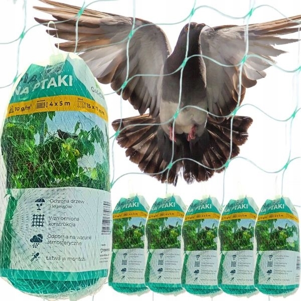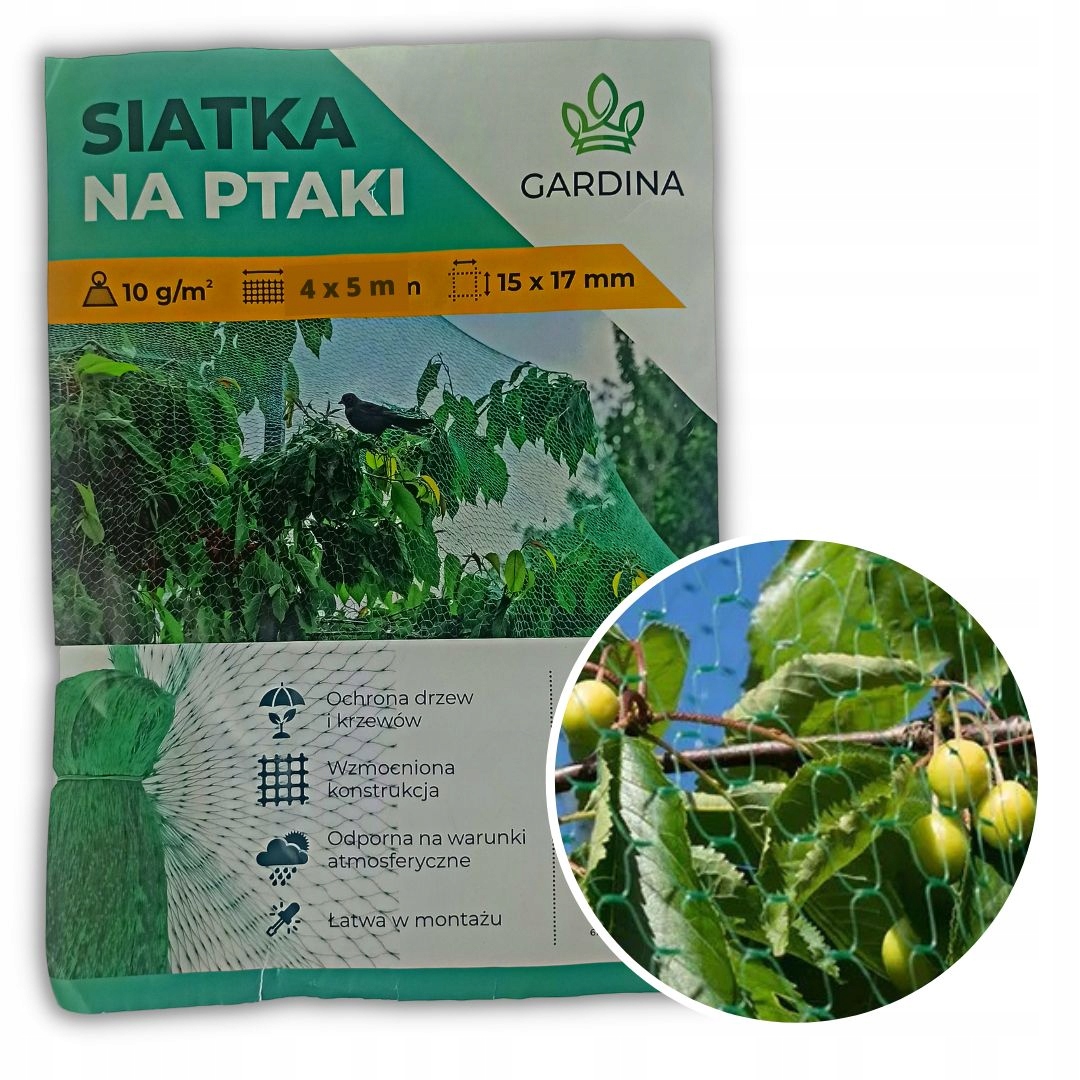 - Bardzo mocna siatka przeciwko ptakom o wymiarach 4m x 5m, zapewnia ochronę roślin w ogrodzie lub sadzie przed ptakami i mniejszymi szkodnikami.