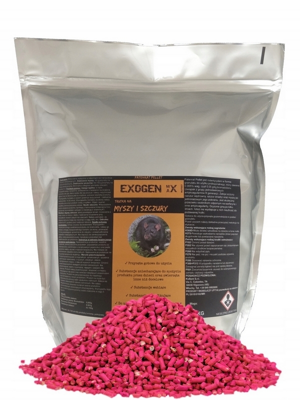 Trutka na szczury Exogen Max to gotowa do użycia wzbogacona o wzmacniacze smaku i zapachu, przynęta gryzoniobójcza, zawierająca substancje czynną o działaniu przeciwzakrzepowym - Bromadiolon. Trutka przeznaczona do zwalczania myszy i szczurów, wewnątrz i wokół budynków oraz na terenach otwartych. Już pojedyncze spożycie pelletu zawierającego bromadiolon ma zdolność eksterminacji gryzonia.