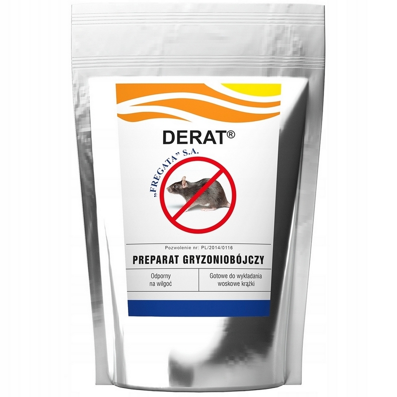 DERAT to gotowa do użycia przynęta w postaci woskowych krążków do zwalczania myszy domowych i szczurów wędrownych, przeznaczona do użytku profesjonalnego. Preparat świetnie sprawdza się w miejscach o dużej wilgotności np. w piwnicach lub systemach kanalizacyjnych. Preparat zawiera najsilniejszy antykoagulant jednodawkowy - brodifakum - oraz benzoesan denatonium - gorzką substancję ograniczającą ryzyko spożycia produktu przez organizmy niebędące przedmiotem zwalczania.