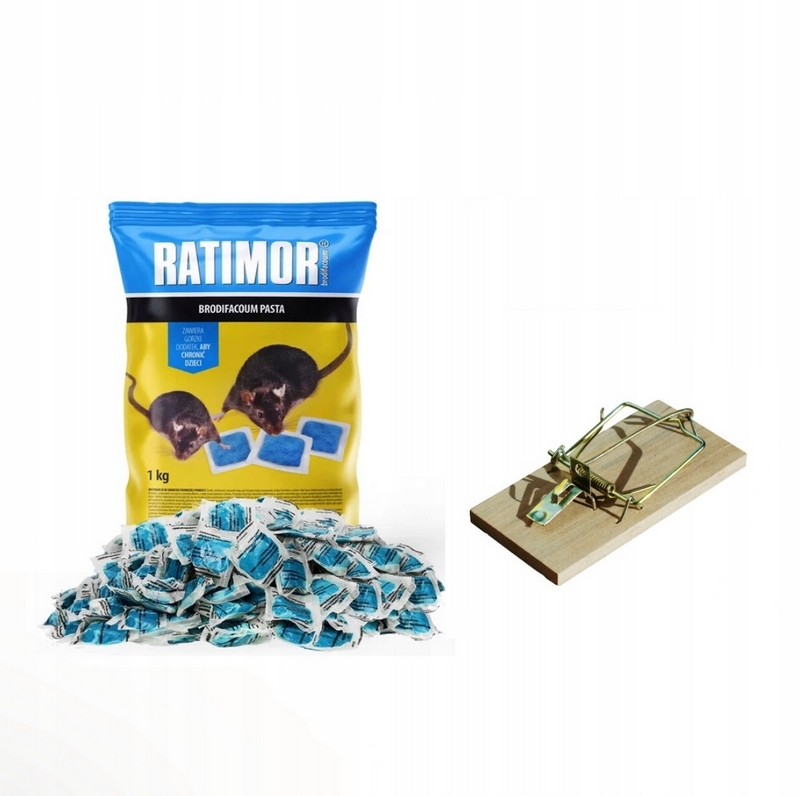 Rewelacyjna trutka RATIMOR w postaci pasty przeznaczona do zwalczania myszy, szczurów, kun i innych gryzoni. Trująca jednodawkowa przynęta pokarmowa w formie pasty o właściwościach mumifikujących, przeznaczona do zwalczania szkodników sanitarnych (szczurów i myszy) w pomieszczeniach (lokalach użyteczności publicznej, hotelach, mieszkaniach, zakładach produkcyjnych, magazynach, obiektach handlowych i inwentarskich, oborach, chlewniach, mleczarniach itp.) oraz na zewnątrz – w bezpośrednim ich sąsiedztwie po umieszczeniu jej w stacji deratyzacyjnej. Trutka nie prowadzi bowiem do zgonu przed upływem 48 godzin, nawet po spożyciu dużej dawki. Dzięki temu inne gryzonie nie nabierają podejrzeń i bez obaw spożywają przynętę aż do całkowitego unicestwienia. Trutka odznacza się dużą skutecznością. Producent obiecuje 100% śmiertelność po jednorazowym spożyciu. Zapewnia ją zawarty w substancji brodifacum. RATIMOR w niewielkich dawkach upośledza proces krzepnięcia krwi. Działa na myszy, szczury śniade i wędrowne itp., w tym na gryzonie odporne na kumarynę i warfarynę. Preparat zawiera gorzką substancję, która zapobiega przypadkowemu połknięciu.