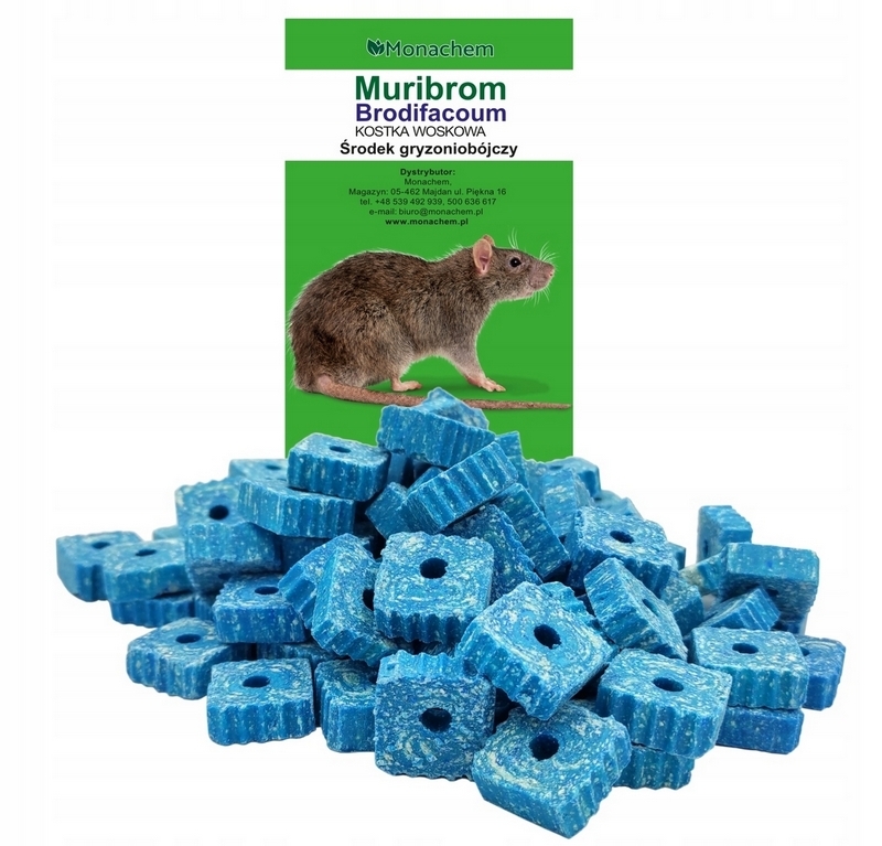 MURIBROM KOSTKA nawet w małych dawkach upośledza krzepnięcie krwi. Działa na szczury śniade i wędrowne, myszy itp..