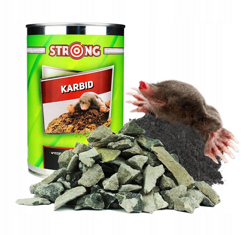 Popularny STRONG KARBID to bardzo skuteczny środek służący pozbyciu się kretów i nornic z naszej działki czy ogródka. Substancja czynna (węglik wapnia) w momencie kontaktu z wodą, czy wilgocią w glebie tworzy lotne związki acetylenu. Oferowany preparat jest oczyszczony z domieszek, dlatego jego skuteczność dominuje nad produktami konkurencyjnych firm. Skład i wielkość grudek karbidu STRONG został tak dobrany, aby zapewniał wysoką reaktywność z wilgocią. Nieprzyjemny zapach wydzielany przez karbid zmusza szkodniki do opuszczenia miejsca, w których został użyty. Skuteczność karbidu w zwalczaniu kretów i nornic została potwierdzona przez szereg badań i testów. Karbid jest doceniany i wykorzystywany przez właścicieli ogródków w całej Polsce i na świecie!