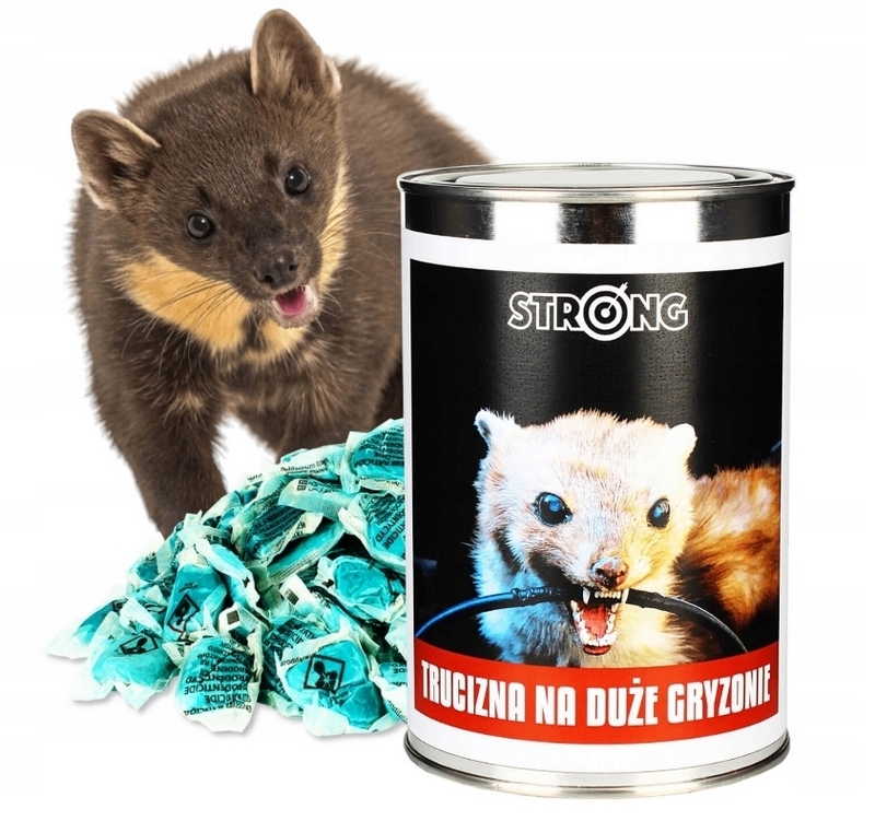 STRONG TRUCIZNA NA DUŻE GRYZONIE to silny preparat gryzoniobójczy skuteczny przeciw trudnym do zwalczania gryzoniom. Preparat dzięki smakowitym składnikom mieszkanki jest wykrywany przez szkodniki nawet ze znacznej odległości, a dzięki zawartości sprawdzonej substancji czynnej - BRODIFACOUM - jest w 100% śmiertelny już po jednorazowym spożyciu.