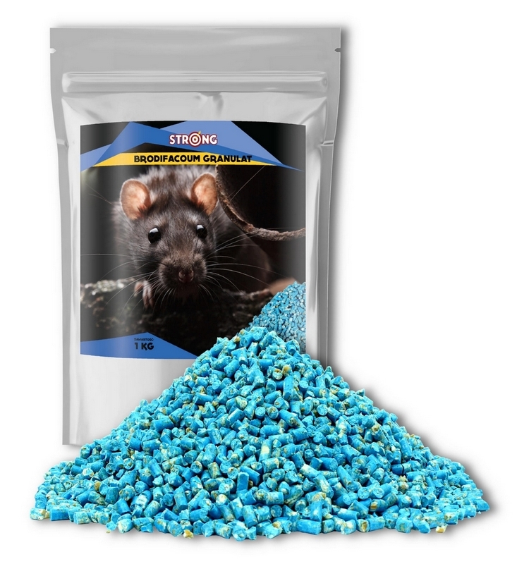 STRONG BRODIFACOUM GRANULAT to bardzo skuteczny środek gryzoniobójczy w formie niebieskiego granulatu do zwalczania myszy i szczurów. Gryzonie po przyjęciu dawki preparatu giną bezstresowo z powodu wewnętrznego krwotoku długo po spożyciu (produkt nie prowadzi do zgonu przed upływem 48 godzin, nawet po spożyciu dużej dawki) i daleko od miejsca wyłożenia. Tym sposobem inne gryzonie nie stają się podejrzliwe i nadal spożywają przynętę aż do całkowitej eksterminacji. Preparat zawiera brodifakum - w 100% śmiertelny już po jednorazowym spożyciu. Dodatkowo, aby zapobiec przypadkowemu połknięciu trutki, w jej składzie znajduje się gorzka substancja - bitrex - niewykrywalna dla gryzoni. Granulat STRONG zawiera starannie dobraną, innowacyjną mieszankę ziaren zbóż i kostki parafinowej tłoczoną na zimno. Powstały w ten sposób pellet zachowuje naturalne aromaty zbóż, które niezwykle skutecznie wabią gryzonie.