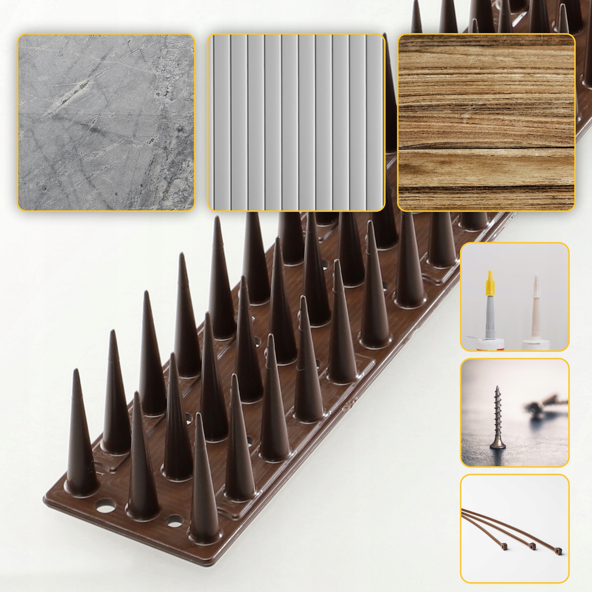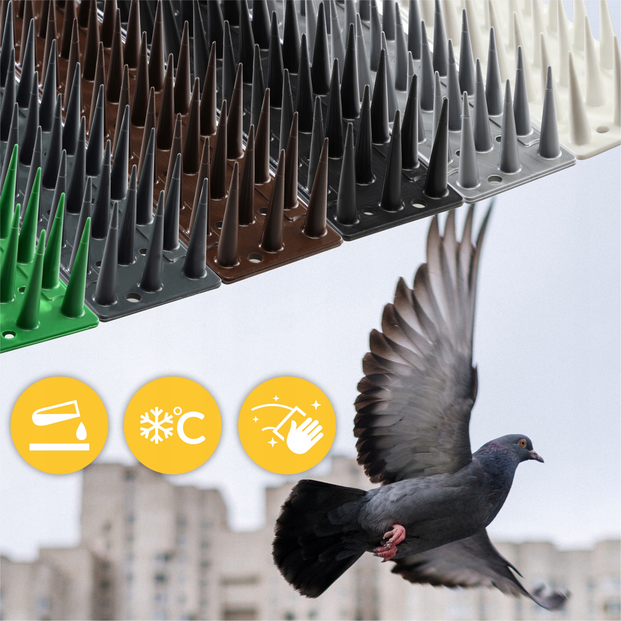 Plastikowe kolce skutecznie zapobiegają lądowaniu i przesiadywaniu gołębi czy dzięciołów w miejscach takich jak parapety, barierki, krawędzie dachów, obróbki blacharskie, gzymsy, kasetony, klimatyzatory czy daszki. Produkt gwarantuje skuteczną ochronę zarówno przed ptakami (gołębie, szpaki), jak i innymi zwierzętami (koty, kuny, wiewiórki). Dodatkowo bogata paleta kolorystyczna pozwala dobrać najbardziej pasującą do zabezpieczanej powierzchni barwę.