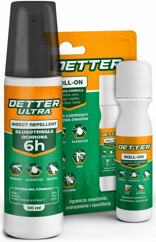 Zestaw na komary, kleszcze, osy Detter - Spray odstraszający owady Detter Ultra i środek na ugryzienia, ukąszenia Roll-On