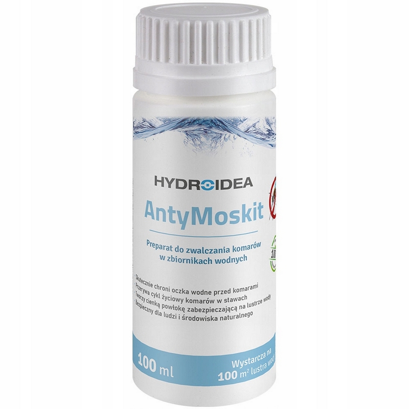AntyMoskit uniemożliwia składanie jaj oraz rozwój larw komarów, poprzez wytworzenie bardzo cienkiej, nie widocznej powłoki silikonowej na lustrze wody. Zatrzymanie cyklu życiowego komarów 100% skuteczność działania. Preparat szybko rozprzestrzenia się równomiernie na całej tafli wody, również pomiędzy roślinnością, zabezpieczając zbiornik. Uzyskana powłoka jest odporna na promieniowanie UV i ruchy wody. Środek nie pozostawia szkodliwych substancji w wodzie, jest całkowicie bezpieczny dla ludzi, roślin, organizmów wodnych i środowiska naturalnego. Zabezpiecza oczka wodne, stawy, wody stojące oraz inne zbiorniki przed rozwojem komarów.