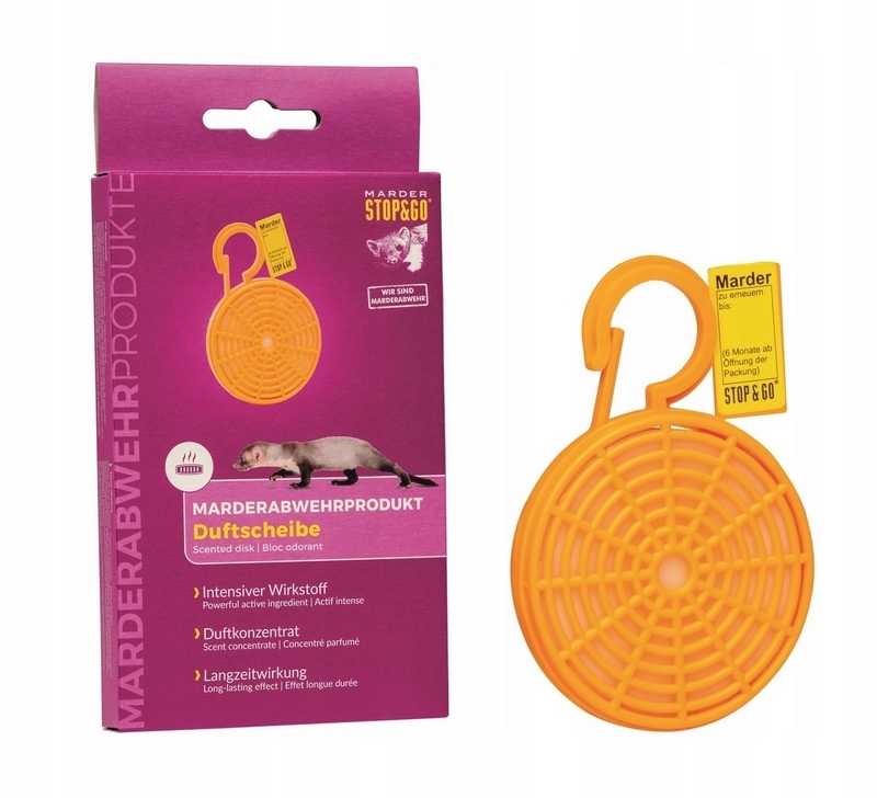 KRĄŻEK ZAPACHOWY ODSTRASZAJĄCY KUNY 6 M-CY MARDER STOP&GOKrążek zapachowy o długotrwałym działaniu – pachnie jak niebezpieczny dla kuny drapieżnik. Praktyczny zaczep, pozwala na łatwy montaż i oferuje szereg opcji mocowania.Przeznaczony jest do uniwersalnego zastosowania w samochodach, domach, ogrod... celý popis