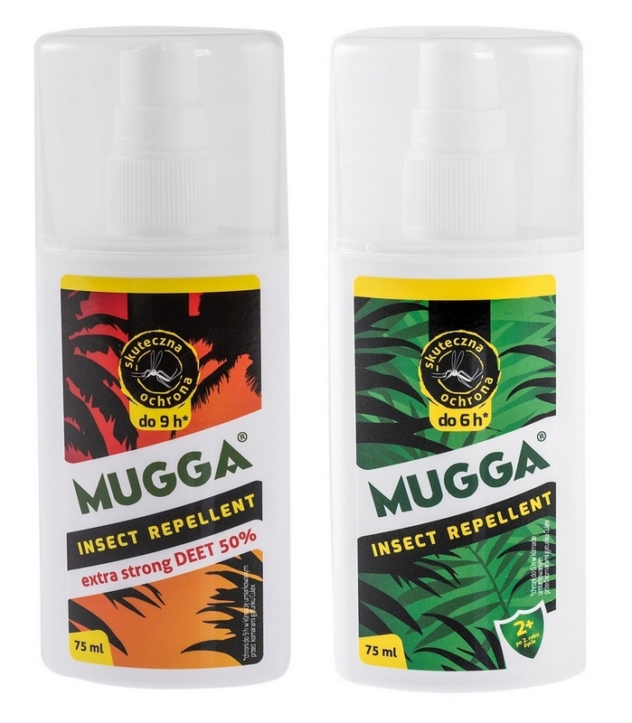 MUGGA w sprayu dla osób dorosłych oraz dzieci od 2 roku życia, o silnym, odstraszającym działaniu przeciwko komarom (europejskim i tropikalnym), muchom, muchom krwiopijnym, meszkom, moskitom, gzom, bąkom, kleszczom i innym insektom. Zabezpiecza przed ukąszeniem przez 6 godzin od zastosowania. Ma przyjemny zapach, można je bezpiecznie stosować na preparaty do opalania i inne kosmetyki.