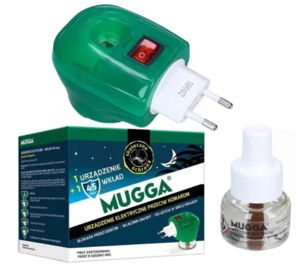 MUGGA Elektro do kontaktu przeciw komarom zapewnia skuteczną ochronę pomieszczeń przed komarami zwabionymi do mieszkań światłem. Wielogodzinne działanie parującej substancji zapewnia ochronę mieszkania przez całą noc. Działa na owady, które znajdują się już w mieszkaniu oraz chronią pomieszczenie przed nalatującymi z zewnątrz.