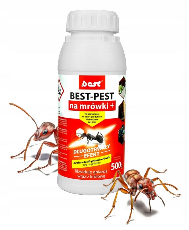 Preparat owadobójczy 500 g w postaci granulowanej przynęty gotowy do użycia, przeznaczony do zwalczania mrówek. Likwiduje wszystkie gatunki mrówek nachodzące do budynków z zewnątrz oraz bytujące w ich pobliżu (na balkonach, tarasach, podjazdach, chodnikach i ścieżkach). Rozsypać równomiernie widoczną warstwę na powierzchni gniazda i ścieżkach, którymi wędrują owady. Wewnątrz pomieszczeń wysypać niewielką ilość preparatu na tacki lub wieczka od słoików i rozstawić w miejscach gromadzenia się mrówek.