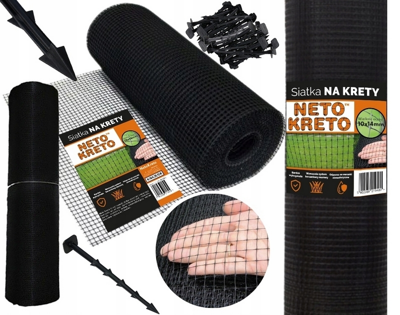 Neto Kreto - siatka przeciw kretom, na krety, oczko 10x14mm - 2x50m + kołki ząbki 50 szt