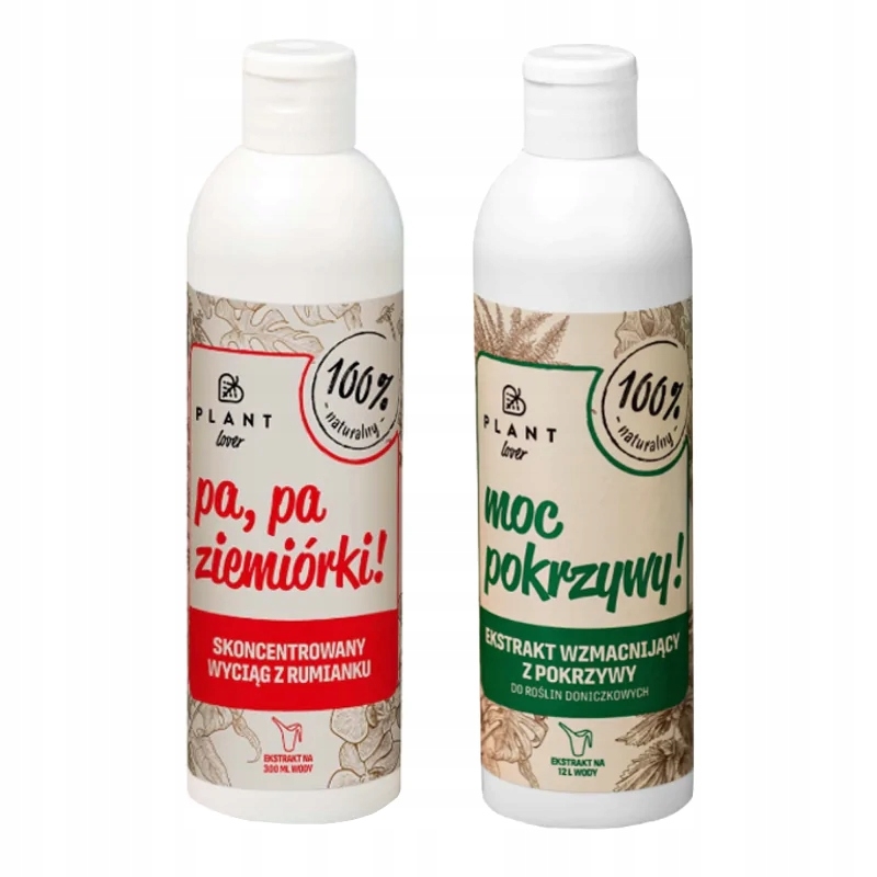 Zestaw 2 rodzajów naturalnych płynnych nawozów marki Plant Lover „Pa, pa ziemiórki" oraz „Moc pokrzywy" przeznaczonych do kompleksowej pielęgnacji roślin doniczkowych.