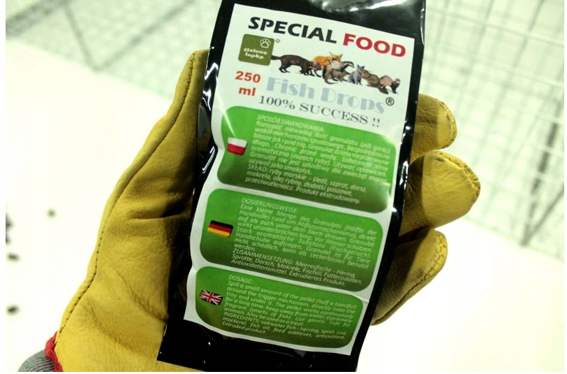 Do tej pułapki dajemy ci specjalną zanętę - to renomowana Fish Drops - są to pastylki o silnym zapachu ryb, które zwabią każde zwierzę z kuną , lisem, wydrą czy szczurem na czele.