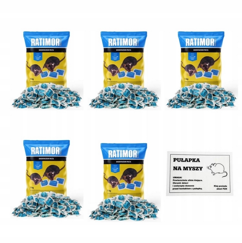 Rewelacyjna trutka RATIMOR w postaci pasty przeznaczona do zwalczania myszy, szczurów, kun i innych gryzoni. Trująca jednodawkowa przynęta pokarmowa w formie pasty o właściwościach mumifikujących, przeznaczona do zwalczania szkodników sanitarnych (szczurów i myszy) w pomieszczeniach (lokalach użyteczności publicznej, hotelach, mieszkaniach, zakładach produkcyjnych, magazynach, obiektach handlowych i inwentarskich, oborach, chlewniach, mleczarniach itp.) oraz na zewnątrz – w bezpośrednim ich sąsiedztwie po umieszczeniu jej w stacji deratyzacyjnej. Trutka nie prowadzi bowiem do zgonu przed upływem 48 godzin, nawet po spożyciu dużej dawki. Dzięki temu inne gryzonie nie nabierają podejrzeń i bez obaw spożywają przynętę aż do całkowitego unicestwienia. Trutka odznacza się dużą skutecznością. Producent obiecuje 100% śmiertelność po jednorazowym spożyciu. Zapewnia ją zawarty w substancji brodifacum. RATIMOR w niewielkich dawkach upośledza proces krzepnięcia krwi. Działa na myszy, szczury śniade i wędrowne itp., w tym na gryzonie odporne na kumarynę i warfarynę. Preparat zawiera gorzką substancję, która zapobiega przypadkowemu połknięciu.