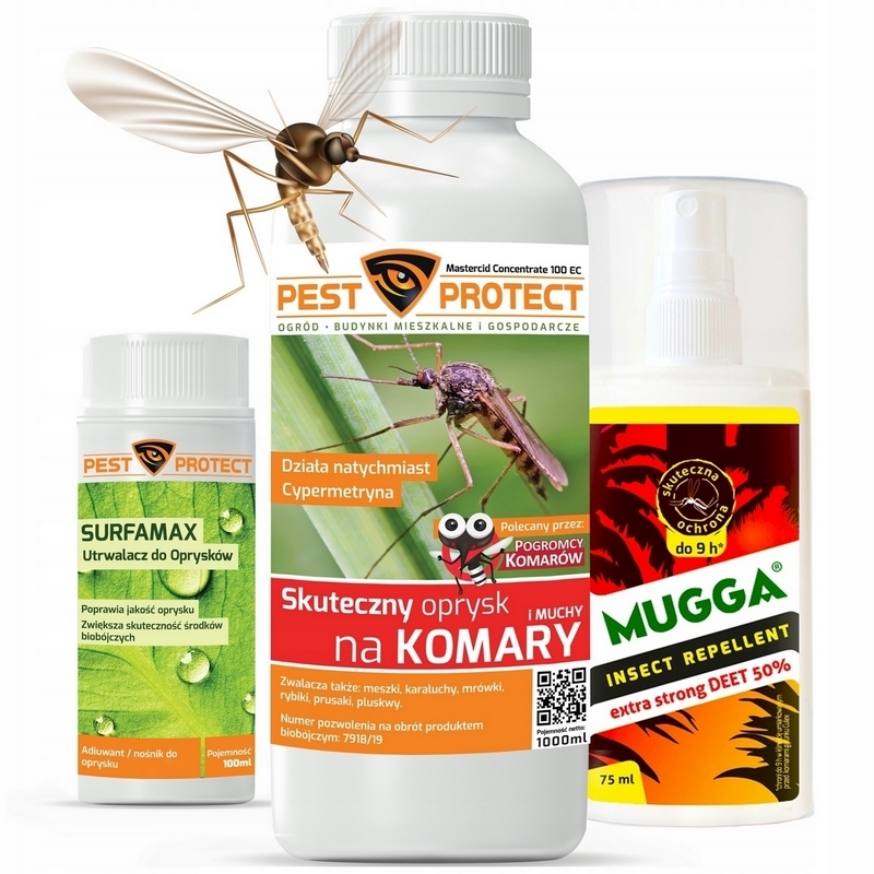 OPRYSK na KOMARY KLESZCZE MUCHY PEST PROTECT 1L + Utrwalacz 100ml + MUGGA SPRAY 50% DEET