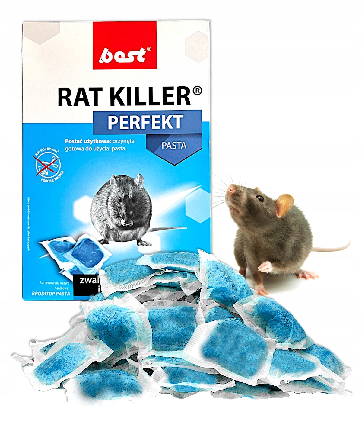 BEST RAT KILLER PERFEKT to pasta w saszetkach o właściwościach mumifikujących, przeznaczona do zwalczania szkodników sanitarnych - myszy i szczurów. Środek zawiera brodifakum, czyli związek z grupy antykoagulantów oraz benzoesan denatonium - czynnik zniechęcający ludzi do spożycia.
