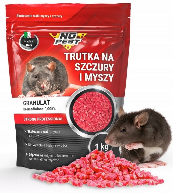 Granulat na szczury No Pest jest używany w pracy przez profesjonalistów. Użyta w trutce substancja czynna Bromadiolone jest zaliczana do środków przeciw zakrzepowych dlatego skutki działania można obserwować już po upływie 4-10 dnipo spożyciu granulatu. Pellet zawiera też gorzki środekzniechęcający do spożycia przez dzieci zwierzęta domowe.