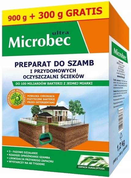 Działanie preparatu: Microbec zawiera wyspecjalizowane kultury bakterii oraz enzymy, które przyspieszają naturalny proces rozkładu resztek organicznych, m.in. nieczystości, tłuszczy, resztek roślinnych, papieru. Obecne w preparacie bakterie ulegają bardzo szybkiemu namnażaniu i już po godzinie od zastosowania ich liczebność w szambie osiąga poziom nawet kilkuset miliardów sztuk. Produkt działa 3-fazowo: zapewnia szybki i skuteczny rozdział zanieczyszczeń, które podlegają upłynnieniu, a następnie enzymatycznemu rozkładowi do całkowicie bezpiecznych i przyjaznych środowisku związków prostych i wody. Pozwala to na oczyszczenie szamba z nagromadzonych osadów i zatorów, zmniejsza częstotliwość opróżniania zbiornika i zapewnia wysoką sprawność działania oczyszczalni. Preparat nie powoduje korozji urządzeń sanitarnych, jest bezpieczny dla ludzi, zwierząt i środowiska.
