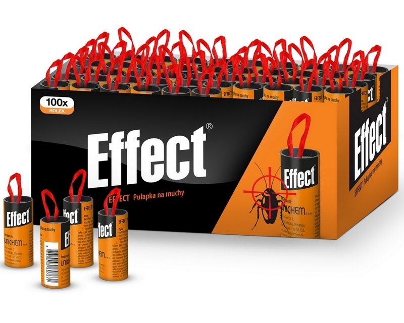 Pułapka lepowa na muchy od firmy Effect zawiera atraktant wabiący muchy, co zwiększa to skuteczność pułapki.