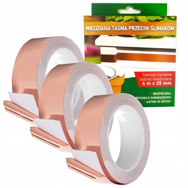 Taśma miedziana, która wykorzystuje elektryczność statyczną obecną w przyrodzie. Kiedy ślimak dotyka miedzianej taśmy, generowany jest niedostrzegalny ładunek elektrostatyczny, który zmusza ślimaka do zejścia, a zatem jest odpowiedni do ochrony roślin doniczkowych, ale także do stworzenia nieprzekraczalnej bariery wokół obszarów, które chcesz chronić przed ślimakami.