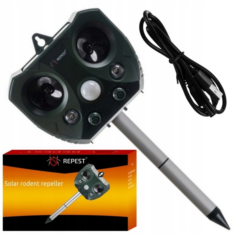 - SOLARNY I SIECIOWY – solarne ładowanie odbywa się w dzień. Wystarczy wbić odstraszacz w ziemię lub zamocować w innym nasłonecznionym miejscu. Dzięki temu urządzenie będzie działało nieprzerwanie przez cały czas. Podczas niesprzyjającej pogody możesz podładować odstraszacz z sieci energetycznej. W zestawie jest kabel USB do ładowania.