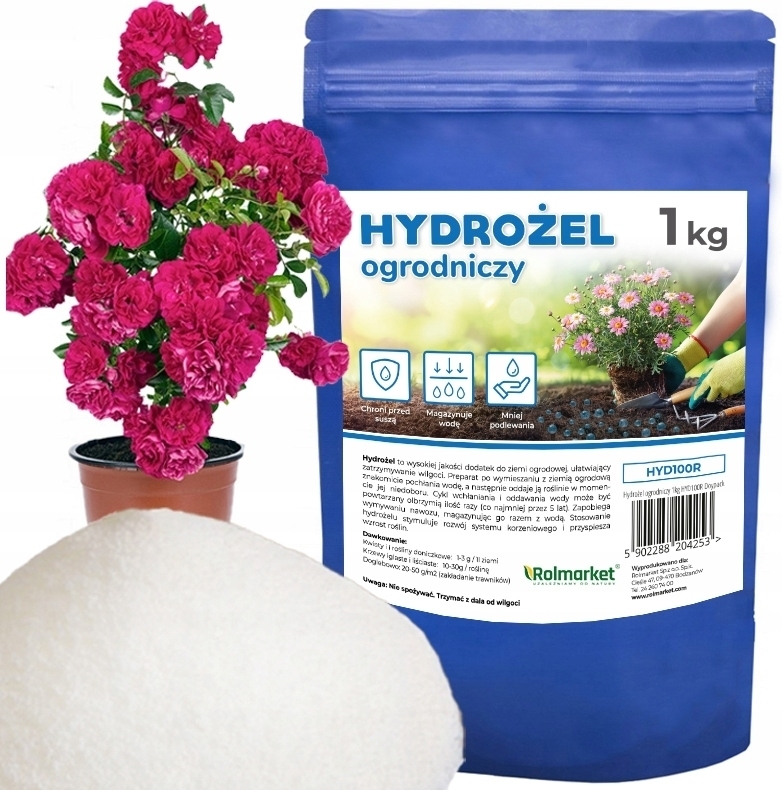 👉 Hydrożel (zwany także agrożelem) jest to wysokiej jakości produkt wykorzystywany do sadzenia lub przesadzania roślin. Preparat po wymieszaniu z ziemią ogrodową znakomicie pochłania wodę pochodzącą z podlewania, deszczu, mgły oraz rosy, a następnie oddaje ją roślinie w momencie jej niedoboru.