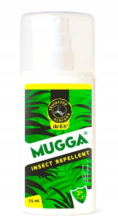 Mugga Spray 9,5% DEET to repelent odstraszający komary, kleszcze, meszki, muchy i inne insekty. Mugga na kleszcze i komary dla dzieci 9,5% DEET oparta jest na substancji syntetycznej DEET i olejkach eterycznych, które skutecznie odstraszają i blokują receptory węchu komarów i innych owadów. Ze względu na niskie stężenie DEET Mugga 9,5% może być stosowana u dzieci od 2 roku życia i kobiet w ciąży. Specjalnie dobrane stężenie zapewnia ochronę przed ukąszeniami, ale jednocześnie jest bezpieczne dla dzieci i przyszłych mam. Zapewnia ochronę do 6 godzin w klimacie umiarkowanym i średnio do 4 godzin w klimacie tropikalnym. Mugga zielona posiada łagodny zapach i łatwo się rozprowadza. Chroni przed: