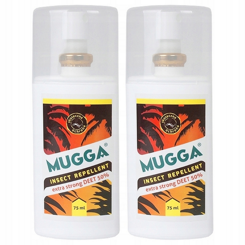 Mugga 50% Strong Spray 75 ml zestaw 2 sztuk to jeden z najbardziej uznanych na świecie repelentów odstraszających komary, kleszcze, meszki oraz inne insekty szukające ludzkiej krwi.