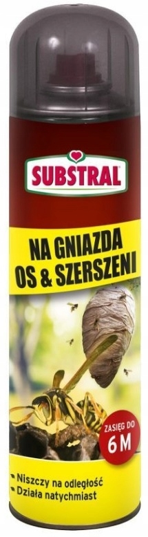 Aerozol marki Substral działa skutecznie na osy, szerszenie i gniazda os i szerszeni. Silny strumień natrysku pozwala zniszczyć gniazdo z bezpiecznej odległości. Dopuszczone do likwidacji os, szerszeni i ich gniazd (Vespa spp).