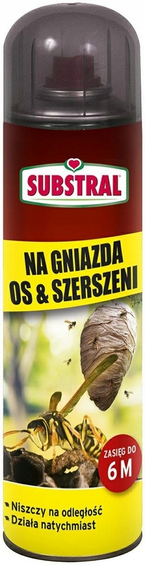 Aerozol marki Substral działa skutecznie na osy, szerszenie i gniazda os i szerszeni. Silny strumień natrysku pozwala zniszczyć gniazdo z bezpiecznej odległości. Dopuszczone do likwidacji os, szerszeni i ich gniazd