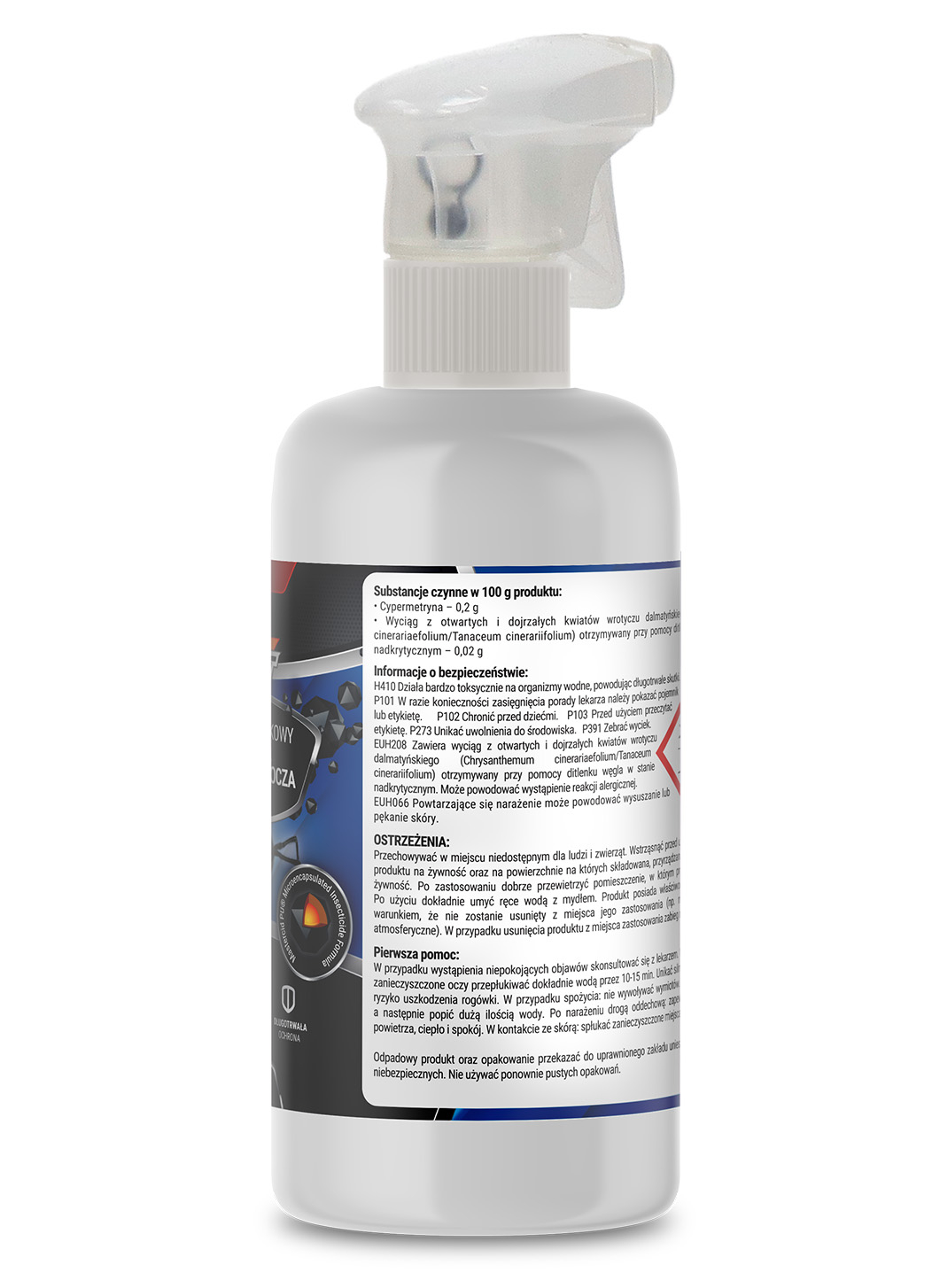 Preparat przeznaczony do zwalczania pająków oraz owadów biegających (pluskiew, prusaków, karaluchów, kowali, pcheł, rybików cukrowych i innych owadów biegających) i latających (komarów, meszek, much i innych owadów latających o podobnej wielkości ciała i sposobie żerowania) w pomieszczeniach.