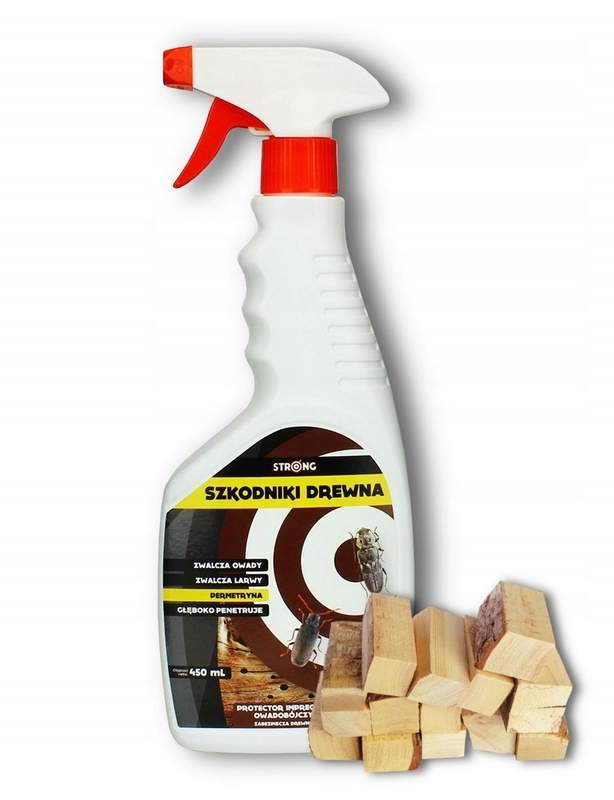 Bezbarwny i bezwonny preparat STRONG NA SZKODNIKI DREWNA jest przeznaczony do zabezpieczania drewna budowlanego, konstrukcyjnego, przed działaniem owadów (technicznych szkodników drewna) i termitów oraz zwalczania w już zainfekowanym drewnie. Środek nie uszkadza tkanin i papieru, ale co ważniejsze, nie przebarwia zabezpieczanego drewna. Środek może również służyć do zabezpieczania drewna przed ponowną inwazją drewnojadów, oraz ochrony przed bakteriami, grzybami i algami.
