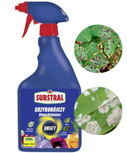 Substral Saprol. Zwalcza i Chroni. Gotowy do użycia długodziałający środek grzybobójczy do róż, kwiatów, roślin kwitnących. Zwalcza plamistość liści, rdzę, mączniaka prawdziwego. Do stosowania w domu i ogrodzie. Działa natychmiast po zastosowaniu. Zapewnia ochronę przed nowymi infekcjami do 3 tygodnie.