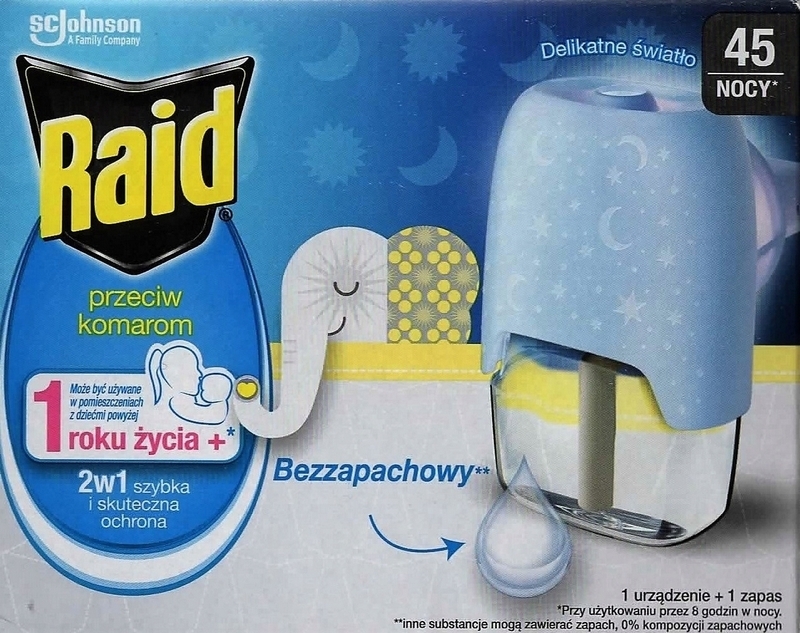 Raid elektrofumigator z płynem owadobójczym chroni przed komarami zapewniając spokojny sen. Zapewnia skuteczną ochronę przed komarami przez całą noc tam, gdzie jest ona najbardziej potrzebna. Produkt jest skuteczny nawet przy lekko otwartych oknach i włączonym świetle. Chroni pomieszczenie do 30m3.