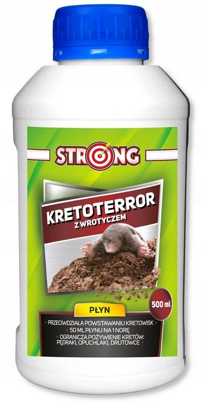 Odstraszacz STRONG KRETOTERROR Z WROTYCZEM jest skutecznym, gotowym do użycia, płynnym produktem o charakterystycznym zapachu wrotyczu. Specjalnie przygotowana kompozycja mikroorganizmów została poddana fermentacji z octem winnym, alkoholem i wrotyczem. Preparat przeciwdziała powstawaniu kretowisk poprzez ograniczenie populacji opuchlaków, pędraków, drutowców. Może być stosowany na lotniskach, ziemnych konstrukcjach hydrotechnicznych, nasypach kolejowych, wałach przeciwpowodziowych i obiektach sportowych.