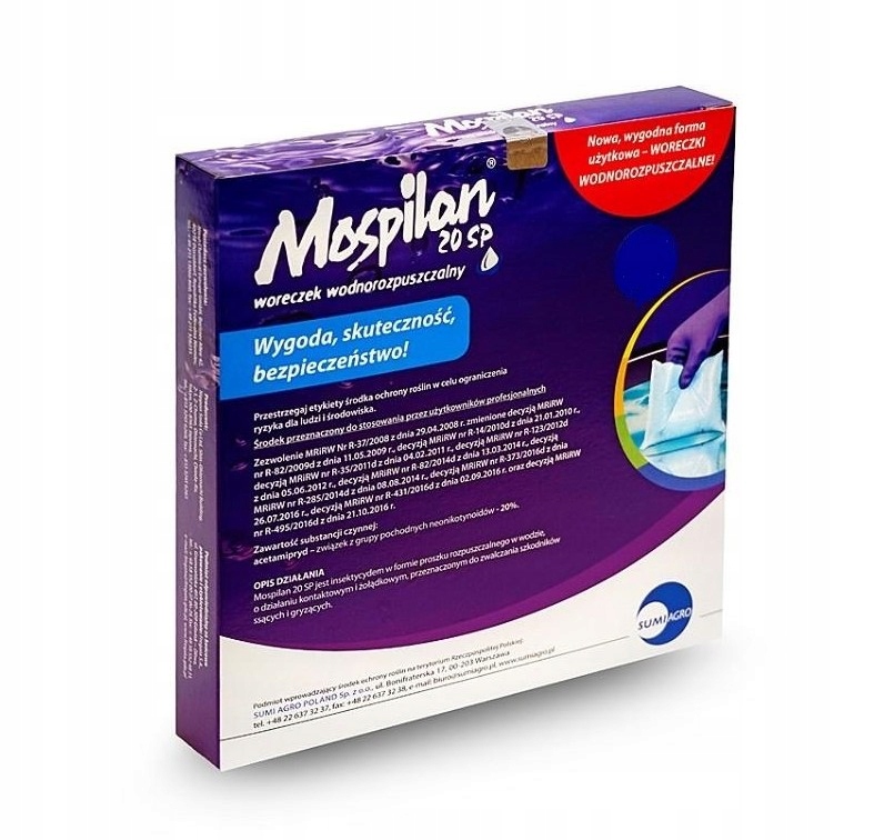 Mospilan 20 SP to środek owadobójczy, insektycyd z firmy Sumi-Agro. Zwalcza szkodniki ssące i gryzące w uprawie ziemniaka, rzepaku ozimego, jabłoni, czereśni, wiśni, gruszy, śliwy, truskawki przy użyciu aparatury naziemnej oraz w lasach przy użyciu aparatury agrolotniczej.Preparat w formie proszku rozpuszczalnego w wodzie. Działa kontaktowo i żołądkowo. Na roślinie działa powierzchniowo, wgłębnie i systemicznie. Zawartoś substancji czynnej: acetamipryd 20,00% Wszystkie szczegóły znajdziesz w poniższej etykiecie! Kliknij tutaj: