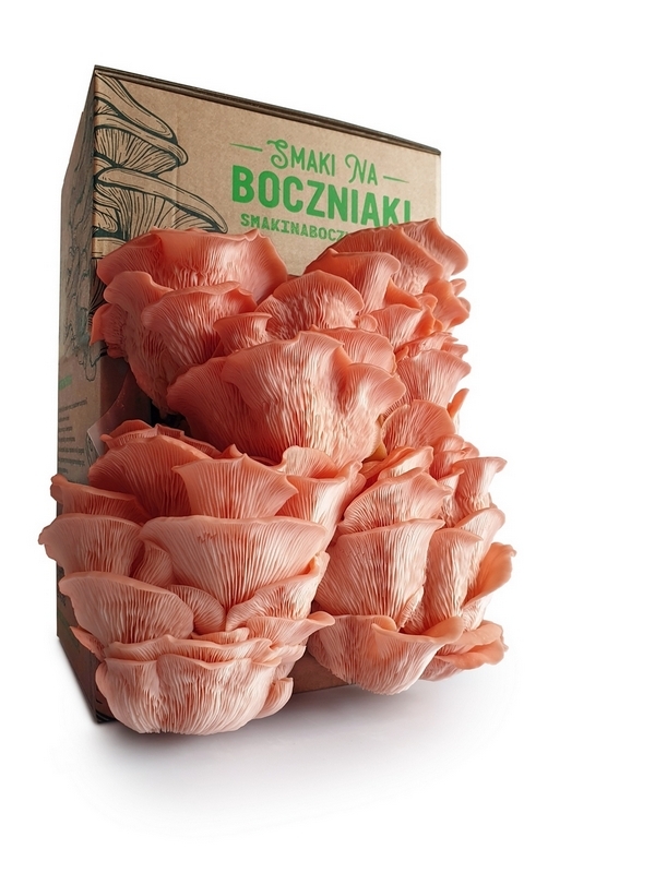 Zestaw do własnej uprawy boczniaków w warunkach domowych firmy Smaki na Boczniaki zawiera grzybnię, opakowanie i spryskiwacz.