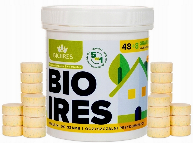 BIOLOGICZNE TABLETKI DO SZAMB I OCZYSZCZALNI KLASY PREMIUM BIOIRES 5w1 - 48 tabletek + 8 gratis