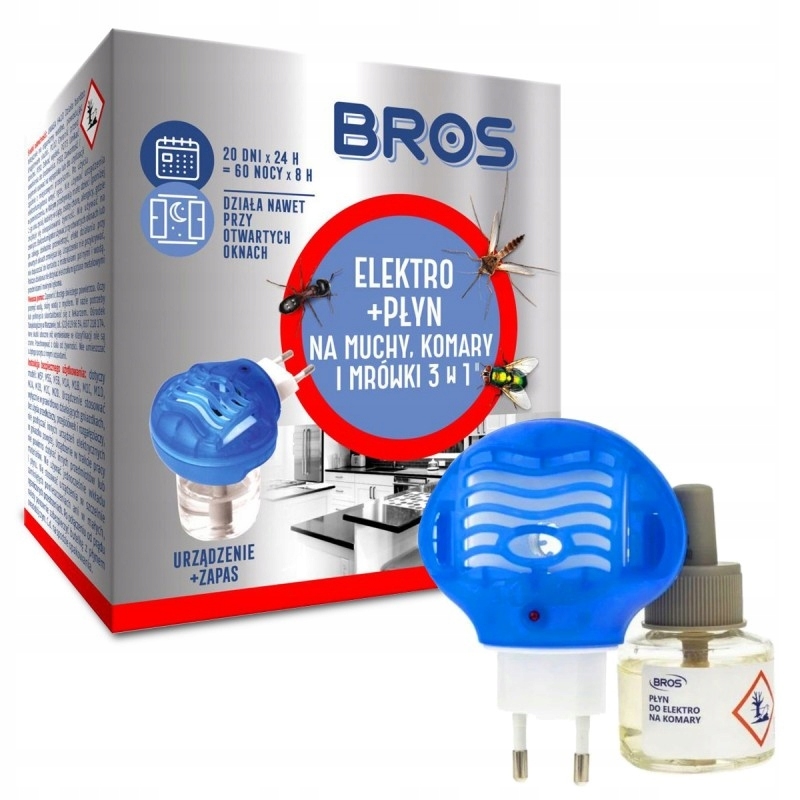 BROS elektrofumigator z płynem o szerokim spektrum działania, do zwalczania much, komarów i mrówek.