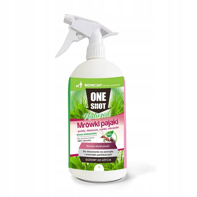 ONE SHOT NATURAL to bardzo mocny, gotowy do użycia preparat zwalczający owady biegające: mrówki, pająki, pchły, karaluchy, prusaki, kleszcze, stonogi, świerszcze, skorki, krocionogi, rybiki i obrzeżki. ONE SHOT NATURAL jest produktem w 100% naturalnym, zawierającym olejki i wyciągi roślinne, oraz naturalne substancje zagęszczające.