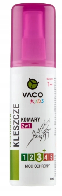 Płyn 2w1 Vaco Kids na komary, kleszcze i meszki skutecznie chroni przed ukąszeniami owadów. Formuła zawiera w składzie 10% IR 3535 uzupełniony o olejek z australijskiego eukaliptusa cytrynowego i jest odpowiednia do stosowania na delikatną skórę małych dzieci od 1 roku życia, jak również dorosłych. Preparat zapewnia ochronę przed owadami utrzymującą się nawet do 5 godzin.