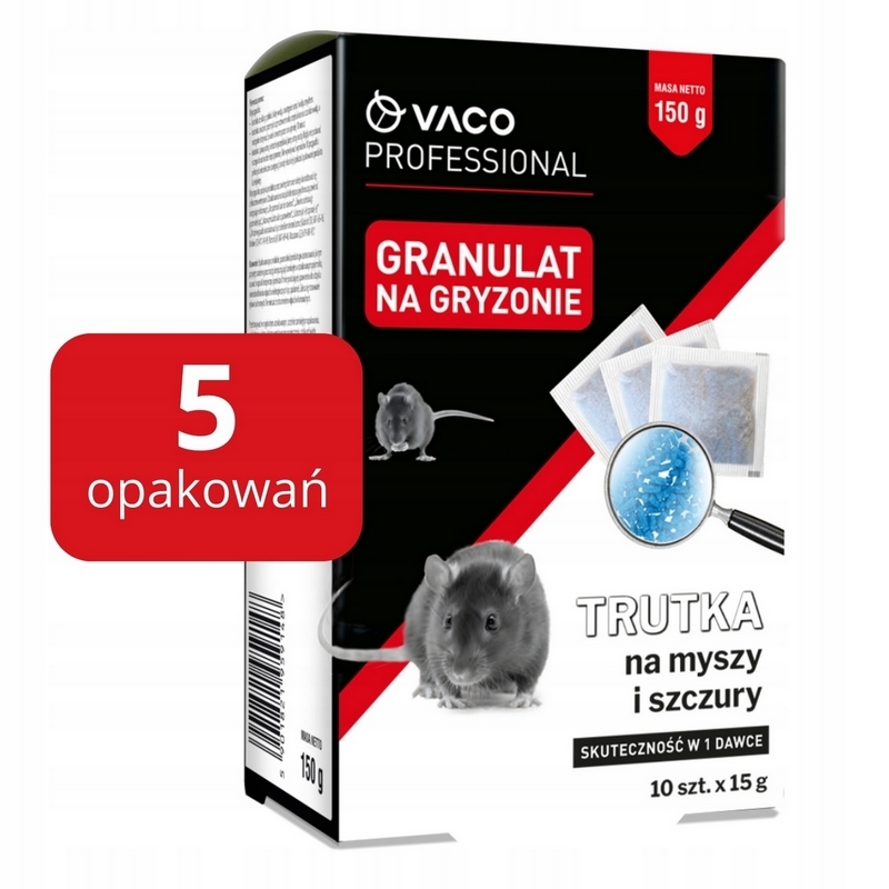 ZESTAW 5x opakowanie - Trutka na myszy szczury saszetki GRANULAT VACO PRO. Jedno opakowanie to 10 saszetek, każda 15gr. ZESTAW 0,75kg. BRODIFAKUM.