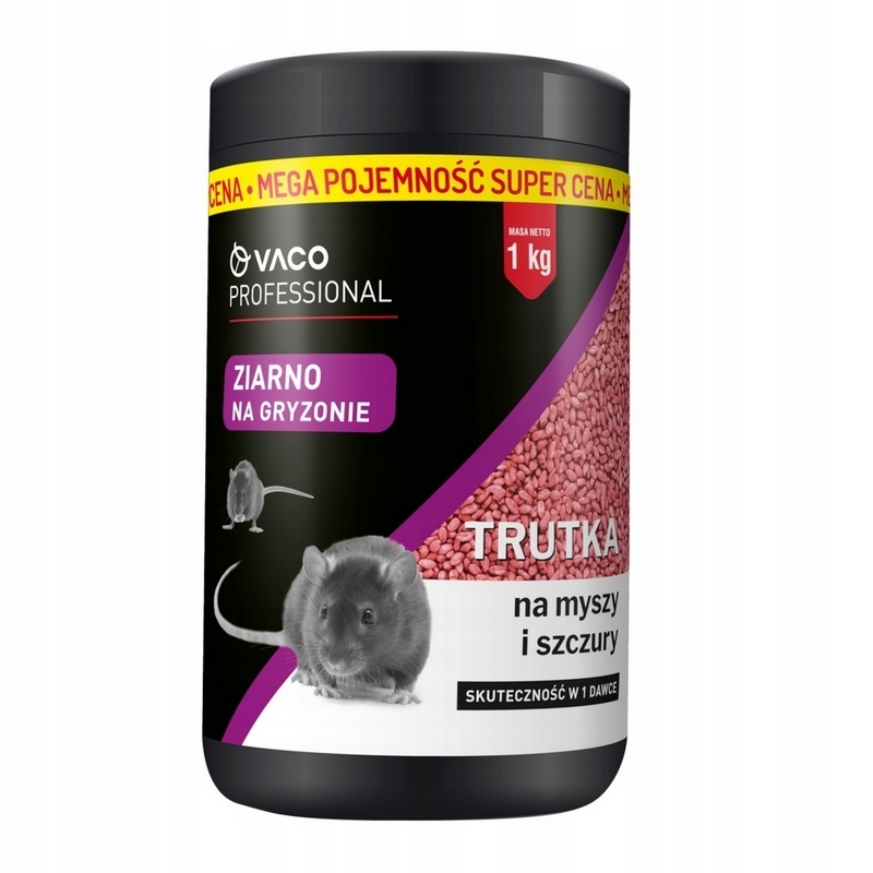 Trutka jest pakowana w solidny słoik, zawierający aż 1 kg ziarna. To maksymalna ilość, która w pełni zabezpiecza Twoje otoczenie przed inwazją gryzoni. Dodatkowo, ten produkt posiada gorzki smak, aby zapobiec przypadkowemu spożyciu przez dzieci i zwierzęta domowe.