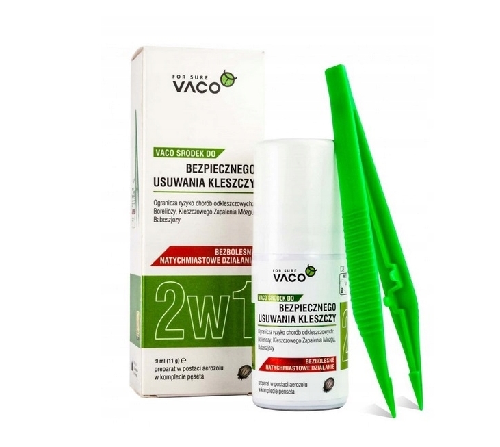 Wyrób "VACO Środek do bezpiecznego usuwania kleszczy" w sposób bezpieczny, prosty i skuteczny eliminuje problem kleszczy. Preparat ma postać nietoksycznego gazu kriogenicznego zamkniętego w zbiorniku ciśnieniowym.